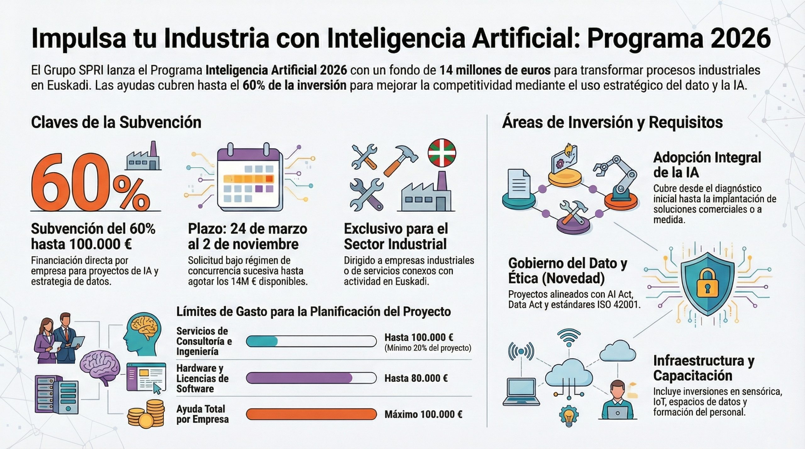 El Programa SPRI de Inteligencia Artificial 2026 representa una oportunidad para las empresas vascas que desean incorporar inteligencia artificial a sus procesos. Con hasta 100.000 euros en ayudas y un presupuesto total de 14 millones de euros, el Gobierno Vasco demuestra su compromiso con la transformación digital del tejido industrial alavés, vizcaíno y guipuzcoano.